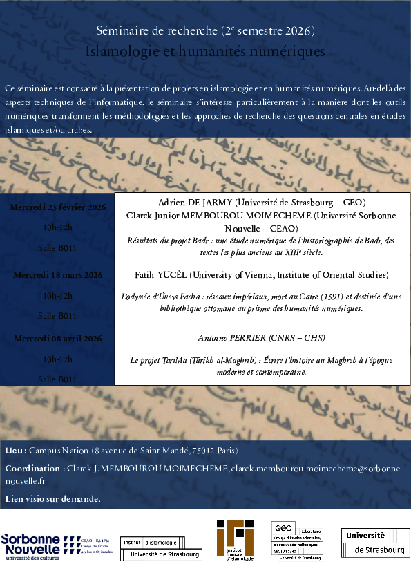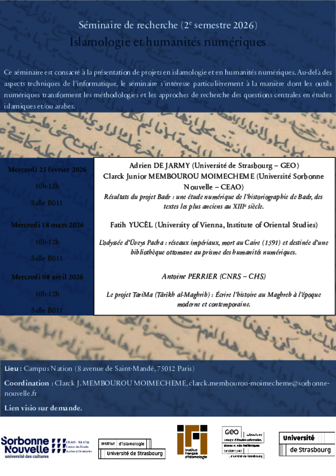 Ce séminaire s’inscrit dans le prolongement de celui organisé durant l'année 2024-2025, intitulé "Islamologie et humanités numériques", et associé au projet BADR. Il sera coorganisé par le CEAO-Université Sorbonne Nouvelle et le GEO/Institut d’Islamologie.