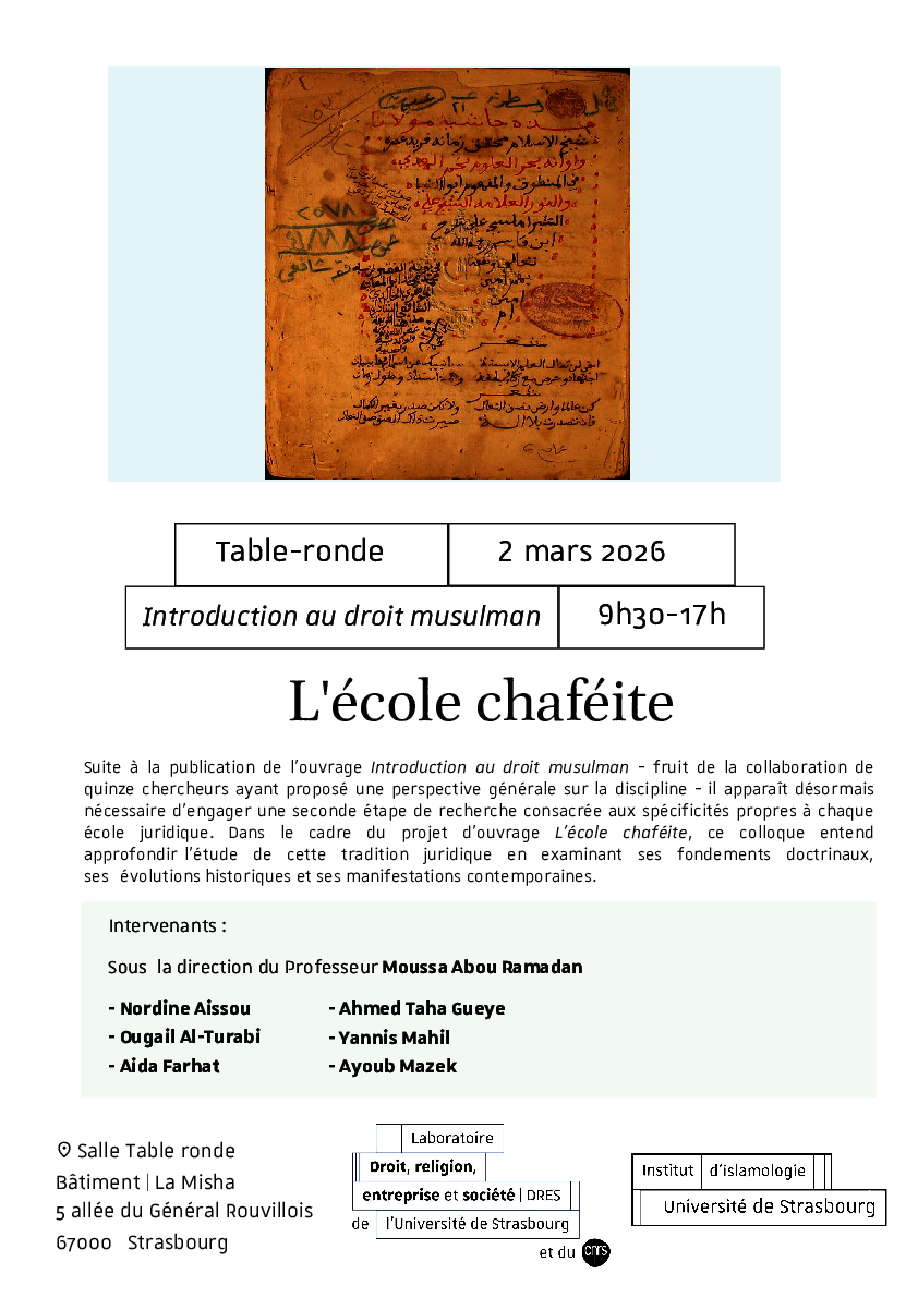 Suite à la publication de l’ouvrage Introduction au droit musulman - fruit de la collaboration de quinze chercheurs ayant proposé une perspective générale sur la discipline - il apparaît désormais nécessaire d’engager une seconde étape de recherche consacrée aux spécificités propres à chaque école juridique. Dans le cadre du projet d’ouvrage L’école chaféite, cette table ronde entend approfondir l’étude de cette tradition juridique en examinant ses fondements doctrinaux, ses évolutions historiques et ses manifestations contemporaines.
